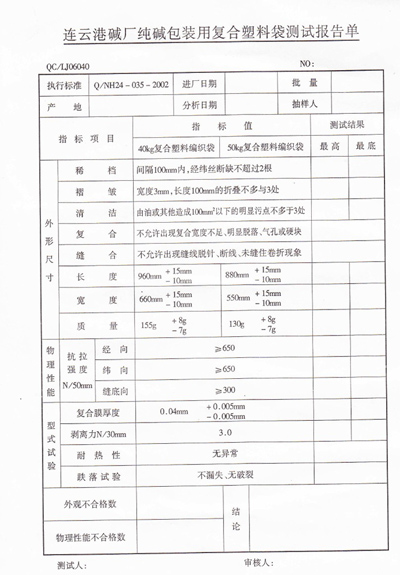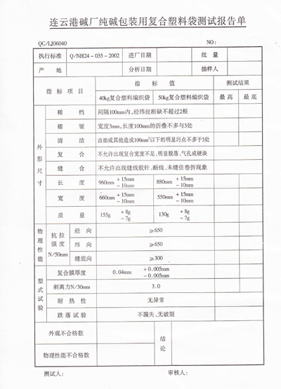 5.6 其他主要資格要求:具有合法有效的生產(chǎn)許可資質(zhì),企業(yè)制度完善、質(zhì)量管理規(guī)范,具有完整的拉絲、織布、縫紉、檢測(cè)等生產(chǎn)線,注冊(cè)資金不少于500萬元(人民幣)。食品包裝袋投標(biāo)人應(yīng)具備食用包裝物生產(chǎn)許可資質(zhì),并提供第三方檢測(cè)報(bào)告。投標(biāo)人必須送樣品袋先經(jīng)我公司質(zhì)檢部門檢測(cè)合格(2018年10月20日之前送到連云港堿業(yè)有限公司供應(yīng)部,原招標(biāo)人供應(yīng)商不需送樣品袋)。符合法律、法規(guī)規(guī)定的其他條件。